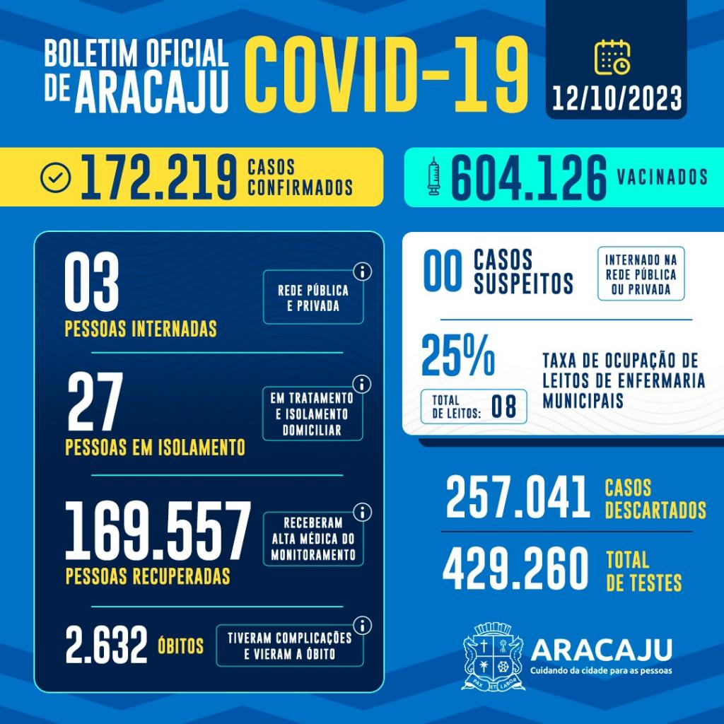 Nesta quinta-feira, 12, foram registrados dois novos casos de covid-19. Com isso, 172.219 pessoas foram diagnosticadas com covid-19 em Aracaju. Destas, duas estão internadas em hospital e 27 estão em isolamento domiciliar; 169.557 que estavam infectados já estão recuperados e 2.632 vieram a óbito.