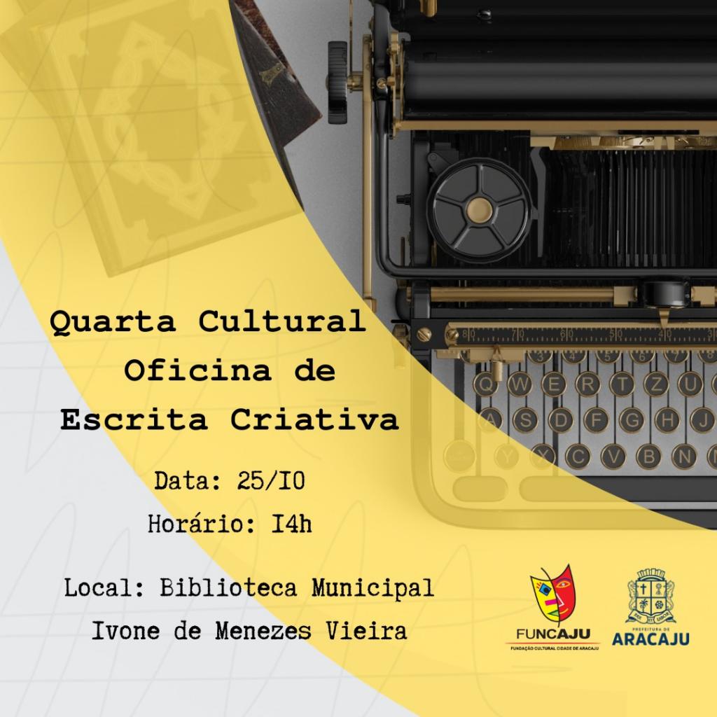 A Fundação Cultural Cidade de Aracaju (Funcaju), por meio da Escola Oficina de Artes Valdice Teles (EOAVT), irá realizar na próxima quarta-feira, 25, às 14h, uma palestra e bate-papo com a professora Acácia Rios, sobre a oficina de Escrita Criativa na Biblioteca Municipal Ivone de Menezes Vieira. A atividade é parte da iniciativa Quarta Cultural, que ocorre todas as semanas na unidade gerida pela Funcaju.