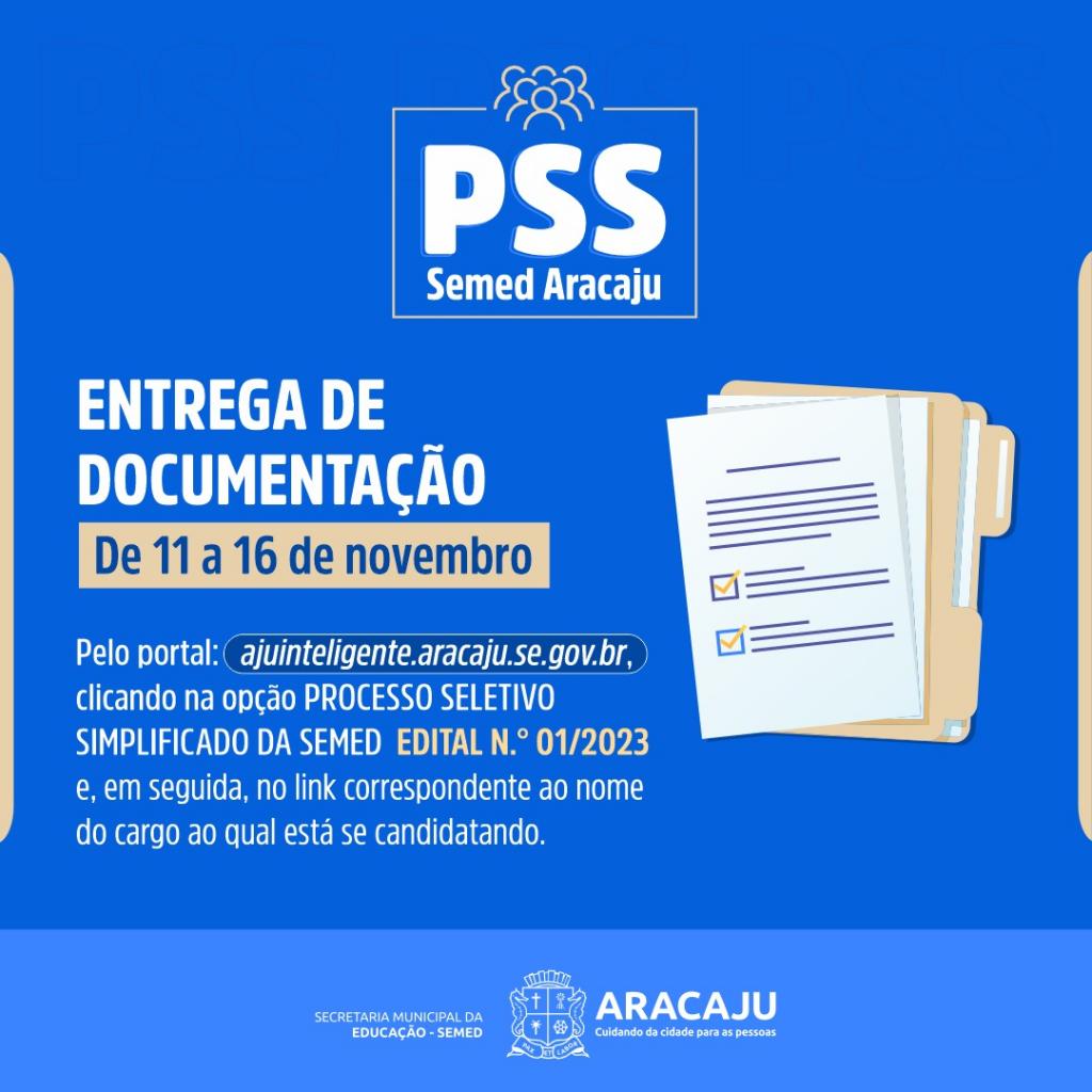 De acordo com o Edital, para enviar a documentação o candidato deve acessar o site www.ajuinteligente.aracaju.se.gov.br, pesquisar e clicar em “PROCESSO SELETIVO SIMPLIFICADO DA SEMED EDITAL N.º 01/2023”, e na opção correspondente ao nome do cargo para o qual está concorrendo a uma vaga. Poderão ser submetidos até 30 documentos em formato PDF, com até 10 megabytes de tamanho. A lista de documentos está nos itens 12 e 13, e subitens, do Edital de Abertura do certame.