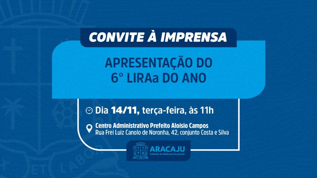 A Prefeitura de Aracaju convida a imprensa para a apresentação do 6° e último Levantamento de Índice Rápido do Aedes aegypti (LIRAa) do ano. A apresentação acontecerá nesta terça-feira, 14, às 11h, no auditório do Centro Administrativo Prefeito Aloísio Campos, e contará com a presença do prefeito Edvaldo Nogueira e da secretária municipal da Saúde, Waneska Barboza.