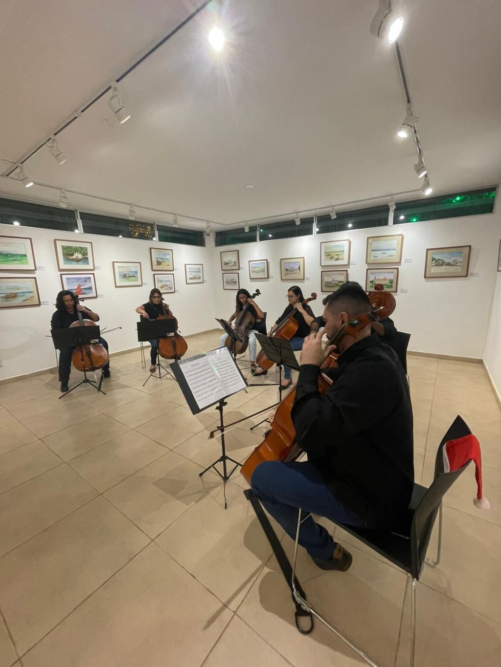 O vernissage ficou a cargo da apresentação musical dos alunos de violoncelo da Escola Oficina de Artes Valdice Teles (EOAVT), que foi parte da abertura da exposição, com a participação de cinco alunos, além do oficineiro que ministra a disciplina, Marcos Antônio. “O objetivo foi agradar ao público, apresentando músicas conhecidas, como de Elvis Presley, Lady Gaga, entre outros, enquanto eles apreciavam tanto o som quanto as obras de arte”, explica o oficineiro.