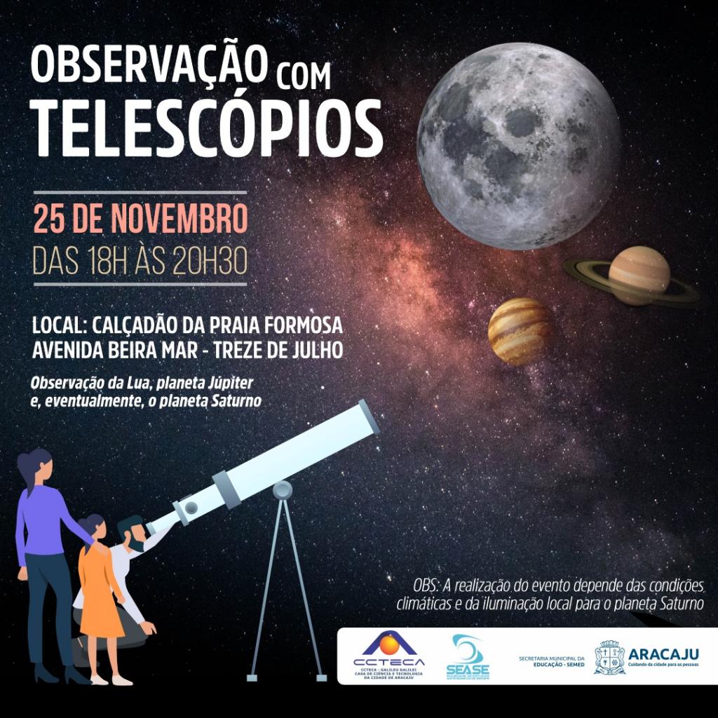Por se tratar de uma iniciativa cultural e educativa que tem atraído centenas de pessoas, a Prefeitura de Aracaju, através da Casa de Ciência e Tecnologia da Cidade de Aracaju (CCTECA) Galileu Galilei, vinculada à Secretaria Municipal da Educação de Aracaju (Semed), realizará a última observação da Lua com telescópios do ano. Gratuito, o evento será realizado no calçadão da Praia Formosa, localizado na avenida Beira Mar, bairro 13 de Julho (na área próxima ao mirante), neste sábado, 25, das 18 às 20h30.