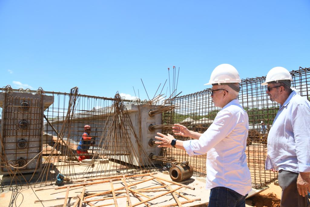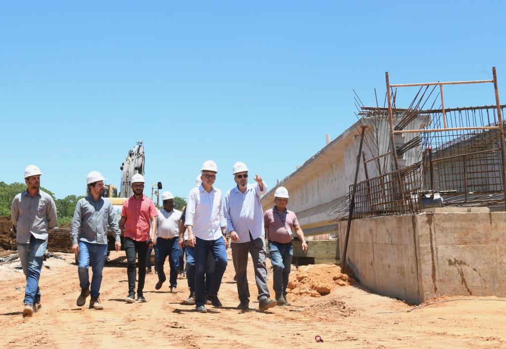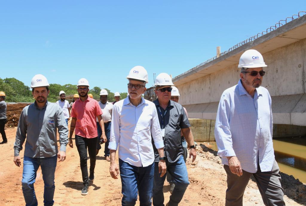 Acompanhado de secretários municipais, o prefeito iniciou a inspeção pelo local onde está sendo aberta a nova via, no bairro Lamarão, trecho que está passando pelo processo de implantação da rede de drenagem, pela realização de aterro e pela colocação de geogrelha. Depois, o gestor e a comitiva seguiram para a área onde está sendo erguida uma ponte sobre o Riacho do Cabral, com 337,4 metros de comprimento e 26 metros de largura, ligando os bairros Bugio e Soledade. Nesta fase, atualmente, está sendo feita a concretagem das vigas, o assentamento de pré-lajes e a implantação de geodrenos. Juntas, essas etapas somam R$ 110 milhões.