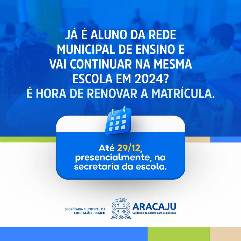 O procedimento para a renovação é simples e realizado de modo presencial. Os pais ou responsáveis, assim como os alunos com 18 anos de idade ou mais, que desejam continuar na mesma escola da rede municipal de ensino de Aracaju no ano letivo 2024, devem comparecer à secretaria da unidade escolar em que está matriculado para assinar o documento de confirmação e entregar algum outro documento que se faça necessário para atualização. Estes também devem ficar atentos ao que solicita cada unidade de ensino, como, por exemplo, fotos 3x4 para a carteirinha escolar.