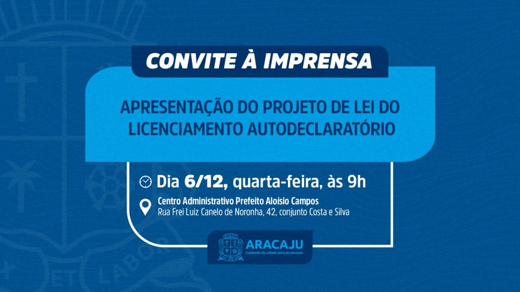 A Prefeitura de Aracaju convida a imprensa para a apresentação do Projeto de Lei do Licenciamento Autodeclaratório, que acontece nesta quarta-feira, 6, às 9h, no auditório do Centro Administrativo Prefeito Aloísio Campos, localizado na rua Frei Luiz Canelo de Noronha, 42, conjunto Costa e Silva.