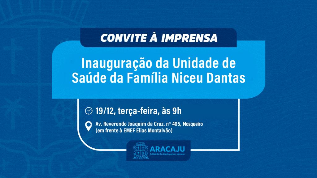 A Prefeitura de Aracaju convida a imprensa para a inauguração da Unidade de Saúde da Família (USF) Niceu Dantas. A solenidade acontecerá na próxima terça-feira, 19, às 9h, na avenida Reverendo Joaquim da Cruz, na antiga Zona de Expansão.
