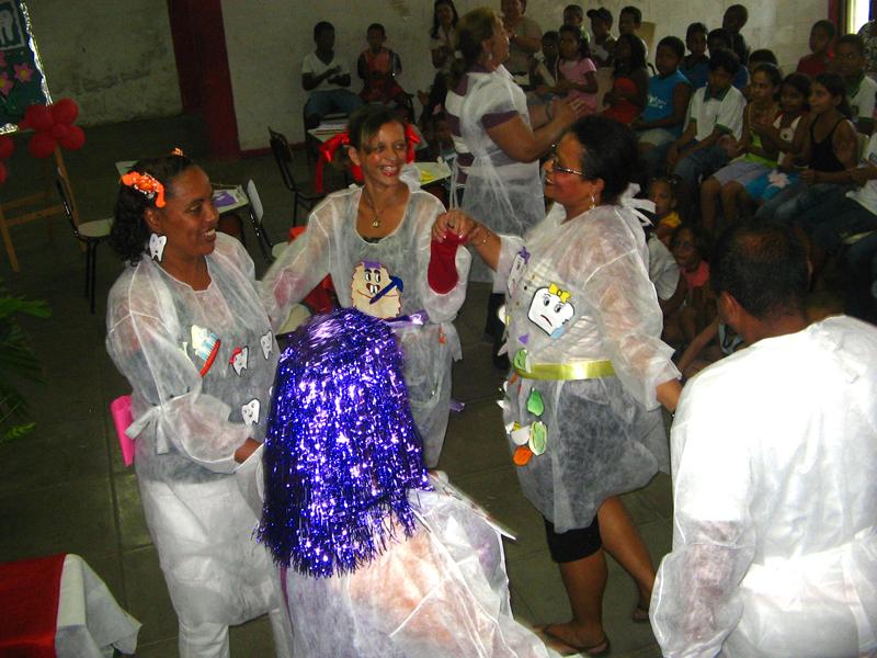 Recreação e educação preventiva para comemorar o Dia do Dentista. Foi dessa forma que o Centro de Saúde do CAIC, localizado no bairro Getúlio Vargas, lembrou o dia daquele profissional tão importante para a saúde bucal. Dezenas de crianças da Escola Municipal Costa Melo assistiram e sorriram muito com a peça teatral `Uma Tremenda Dor de Dente´, encenada pelos agentes comunitários de saúde da própria unidade. No nosso dia, a gente tem que mostrar que a odontologia tem que atuar com ações educativas como o teatro. A idéia é motivar e sensibilizar para a saúde bucal. As crianças aprendem bem por meio do lúdico e a gente quer despertar a criançada para cuidar dos dentes, informou a odontóloga do Centro de Saúde do CAIC, Juçara Santana Brandão Teles. Todos os anos, a unidade de saúde realiza a comemoração com as crianças, para que a educação preventiva comece desde cedo. Com faixa etária entre 5 e 12 anos, as crianças que participaram da ação ganharam um delicioso lanche, além de um kit contendo um creme dental e uma escova de dente. O objetivo foi estimular a prática da escovação. Durante a encenação, os agentes comunitários de saúde abordaram a importância de cuidar dos dentes evitando comer doces, balas e outros alimentos açucarados. Os atores mostraram que o ideal é ter o acompanhamento de um dentista para manutenção e limpeza periódicas da dentição, ter uma alimentação mais saudável e sempre escovar os dentes após as refeições. A comemoração contou com a presença dos profissionais do Centro de Saúde do Caic; da gerente Karina Clécia; da Coordenadora da 5ª Região, Sílvia Menezes; da coordenadora do Programa de Saúde Bucal, Iucema Santana Santos; e de professores da escola. O Centro de Saúde do Caic atende às comunidades dos bairros Getúlio Vargas e Cirurgia. A unidade possui uma cobertura de mais de 16 mil pessoas e conta com quatro equipes de saúde da família.