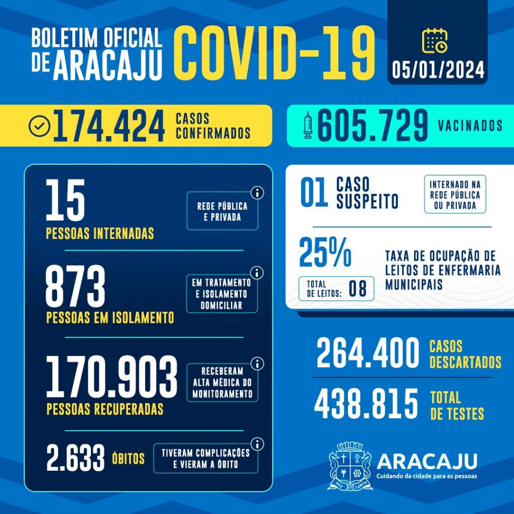Com isso, 174.424 pessoas foram diagnosticadas com covid-19 em Aracaju. Destas, 15 estão internadas em hospital e 873 estão em isolamento domiciliar; 170.903 que estavam infectados já estão recuperados e 2.633 vieram a óbito.