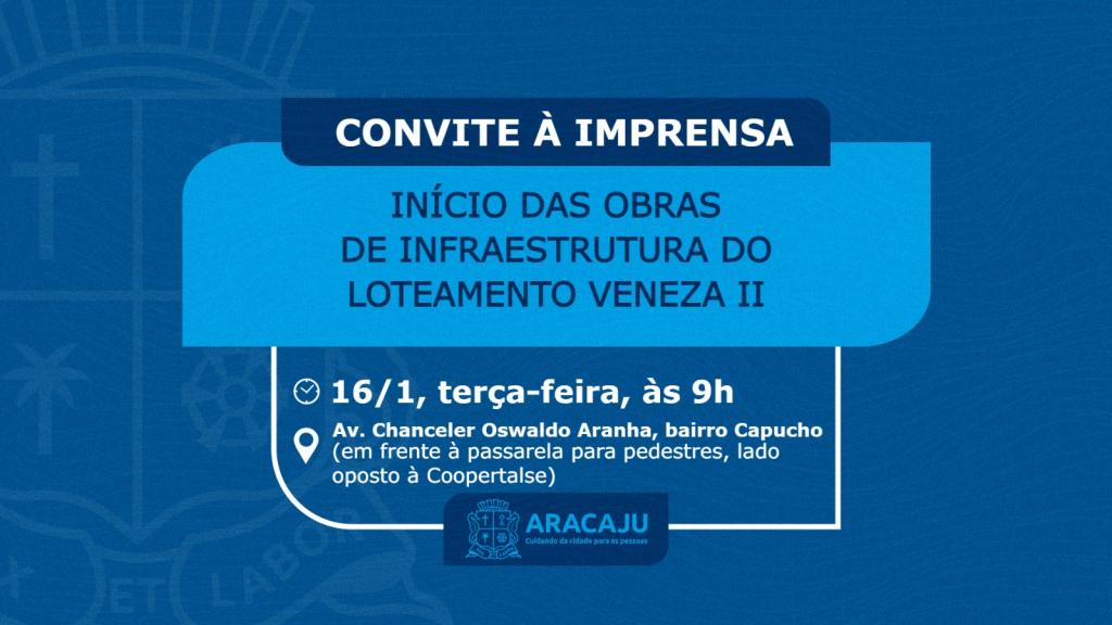 A Prefeitura de Aracaju convida a imprensa para o início das obras de infraestrutura do loteamento Veneza II, no bairro Capucho. A solenidade acontecerá nesta terça-feira, 16, às 9h, na avenida Chanceler Osvaldo Aranha (em frente à passarela para pedestres, lado oposto à Coopertalse).