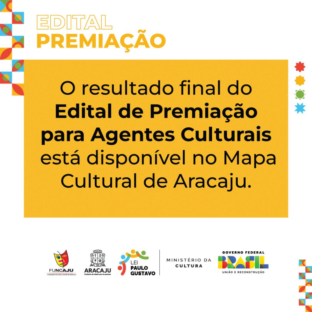 A Prefeitura de Aracaju, por intermédio da Fundação Cultural Cidade de Aracaju (Funcaju), torna público a lista com o resultado final do Edital de Premiação para Agentes Culturais, da Lei Paulo Gustavo em Aracaju, por meio de recursos do Fundo Nacional da Cultura (FNC), provenientes do Ministério da Cultura (MinC).