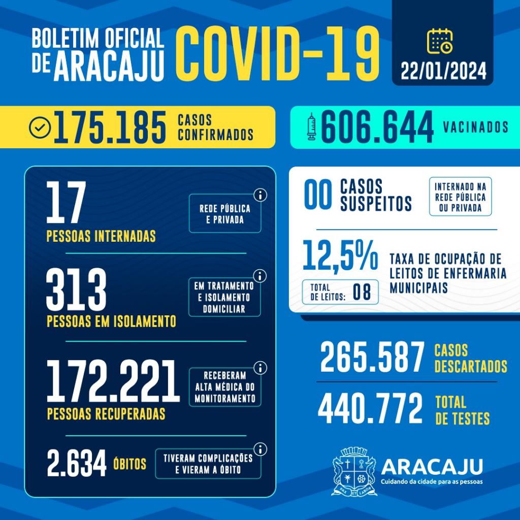 Com isso, 175.185 pessoas foram diagnosticadas com covid-19 em Aracaju. Destas, 17 estão internadas em hospital e 313 estão em isolamento domiciliar; 172.221 que estavam infectados já estão recuperados e 2.634 vieram a óbito.