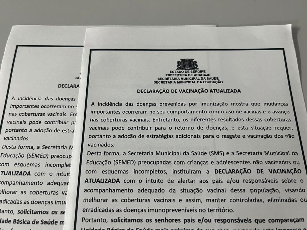 Com o intuito de aumentar a cobertura vacinal, em especial nos índices referentes à imunização infantil, além de otimizar o fluxo, a Prefeitura de Aracaju, de forma intersetorial, por meio das Secretarias Municipais da Saúde (SMS) e da Educação (Semed), através do Programa Saúde na Escola (PSE), instituiu a entrega da “Declaração de vacinação atualizada”, no ato da matrícula, nas escolas da rede municipal e estadual.