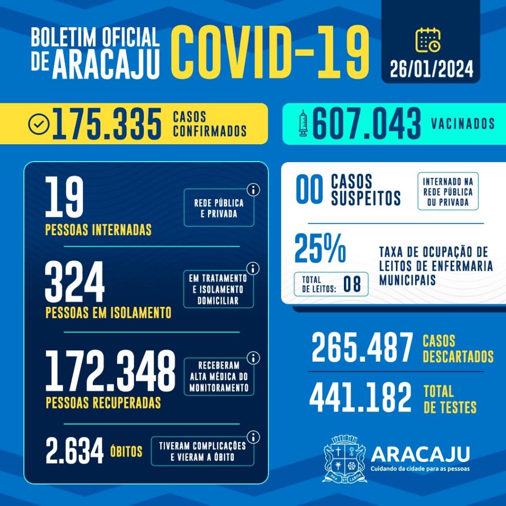 Com isso, 175.335 pessoas foram diagnosticadas com covid-19 em Aracaju. Destas, 19 estão internadas em hospital e 324 estão em isolamento domiciliar; 172.348 que estavam infectados já estão recuperados e 2.634 vieram a óbito.
