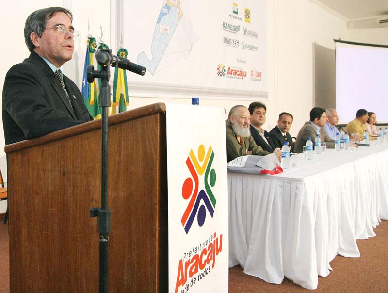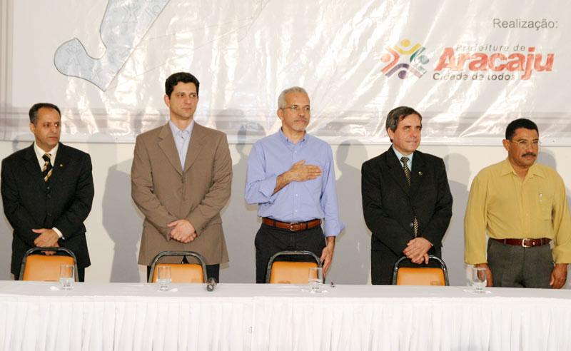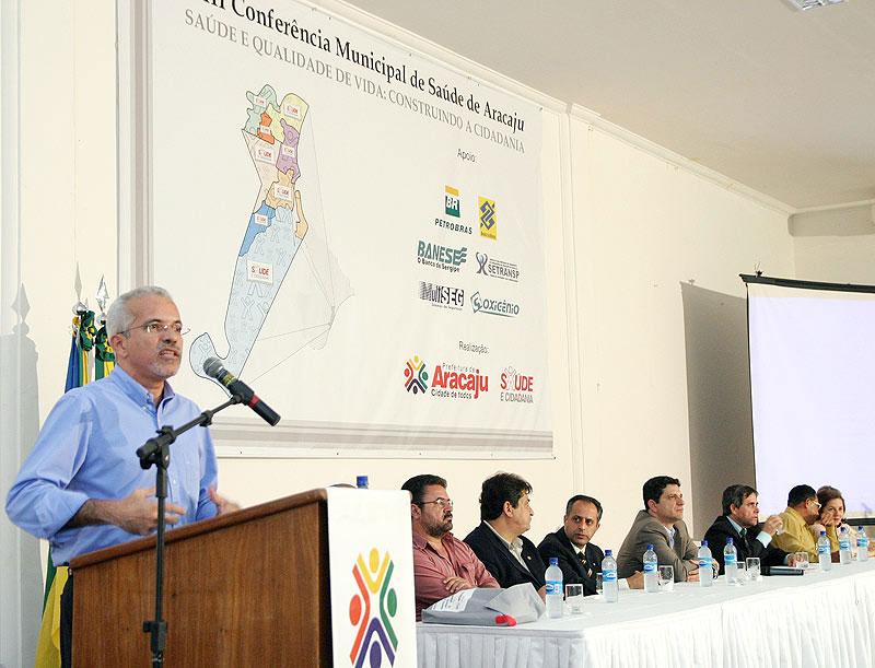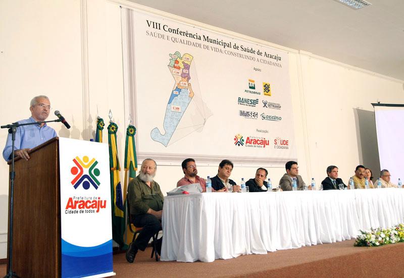 Discutir democraticamente com a sociedade os rumos da política de saúde da capital sergipana. Com esse objetivo, o prefeito de Aracaju, Edvaldo Nogueira abriu solenemente a VIII Conferência Municipal de Saúde, na noite de ontem, quinta-feira, no auditório do Hotel Parque dos Coqueiros. Organizado pela Secretaria Municipal de Saúde (SMS), o evento reunirá gestores, funcionários e usuários do sistema em debates que seguem até sábado. A solenidade, que teve a execução do Hino Nacional realizada pela Orquestra Sanfônica de Aracaju, contou também com a presença do secretário municipal de Saúde, Marcos Ramos; do secretário de Estado da Saúde, Rogério Carvalho; do presidente do Conselho Municipal de Saúde; Régis Barbosa; do promotor de Justiça, Rone Almeida e do vereador Francisco dos Santos, representando a Câmara Municipal de Aracaju. O prefeito Edvaldo Nogueira destacou a Conferência como um importante instrumento na buscar de melhorias no serviço prestado à população. Ele apresentou dados que apontam avanços na qualidade nos últimos anos e justificou que eles eram necessários para nortear as discussões em busca de novos avanços. Para o prefeito os problemas devem ser encarados com esse compromisso. Nós estamos vivendo um momento privilegiado em que os cidadãos estão sendo chamados para discutir, debater, criticar, mas no sentido de que a gente possa melhorar o sistema de saúde da cidade. Mostrem o que está errado, essa é a hora de fazer um apanhado, do cidadão de todas as partes de Aracaju se colocar de maneira igualitária para buscar resolver os problemas que ainda existem, disse o prefeito aos participantes. Para o secretário Marcos Ramos, a conferência é um momento de avaliação muito importante para política municipal de saúde. De acordo com as diretrizes do Sistema Único de Saúde, o SUS, vamos discutir a saúde no município, vamos renovar o Conselho Municipal de Saúde e eleger os delegados que participarão da 4ª Conferência Estadual de Saúde. Estamos em processo evolutivo de construção do nosso SUS, temos avançado, mas ainda temos muito o que fazer e a responsabilidade de construir um sistema ideal é de todos, declarou. Após a abertura solene, foi exibido um vídeo mostrando as etapas preparatórias para esse evento, que foram as pré-conferências realizadas nas unidades de saúde da família. Em seguida o médico sanitarista, Gilson Carvalho iniciou a palestra da noite, tem da 8ª Conferência: ´Saúde e Qualidade de Vida: construindo a cidadania´. Ao final da programação da noite, foi servido um coquetel aos presentes. A Conferência teve a participação ainda do representante dos servidores no Conselho Municipal de Saúde, Marcos Santana e da representante dos usuários, Ivânia Pereira da Silva. Estiveram presentes também o presidente do Sindicato dos Médicos de Sergipe, José Menezes; o presidente da Central Única dos Trabalhadores (CUT/SE), além dos secretários municipais Bosco Rolemberg (Governo), Jeferson Passos (Finanças), Valmor Bezerra (Obras e Urbanização), Rosária Rabelo (Assistência Social e Cidadania), Lucimara Passos (Cultura, Turismo e Esporte), Carlos Magno (Trabalho e Renda), coronel Magno Silvestre (Guarda), Luciano Pimentel (Planejamento) e Rômulo Rodrigues (Participação Popular).