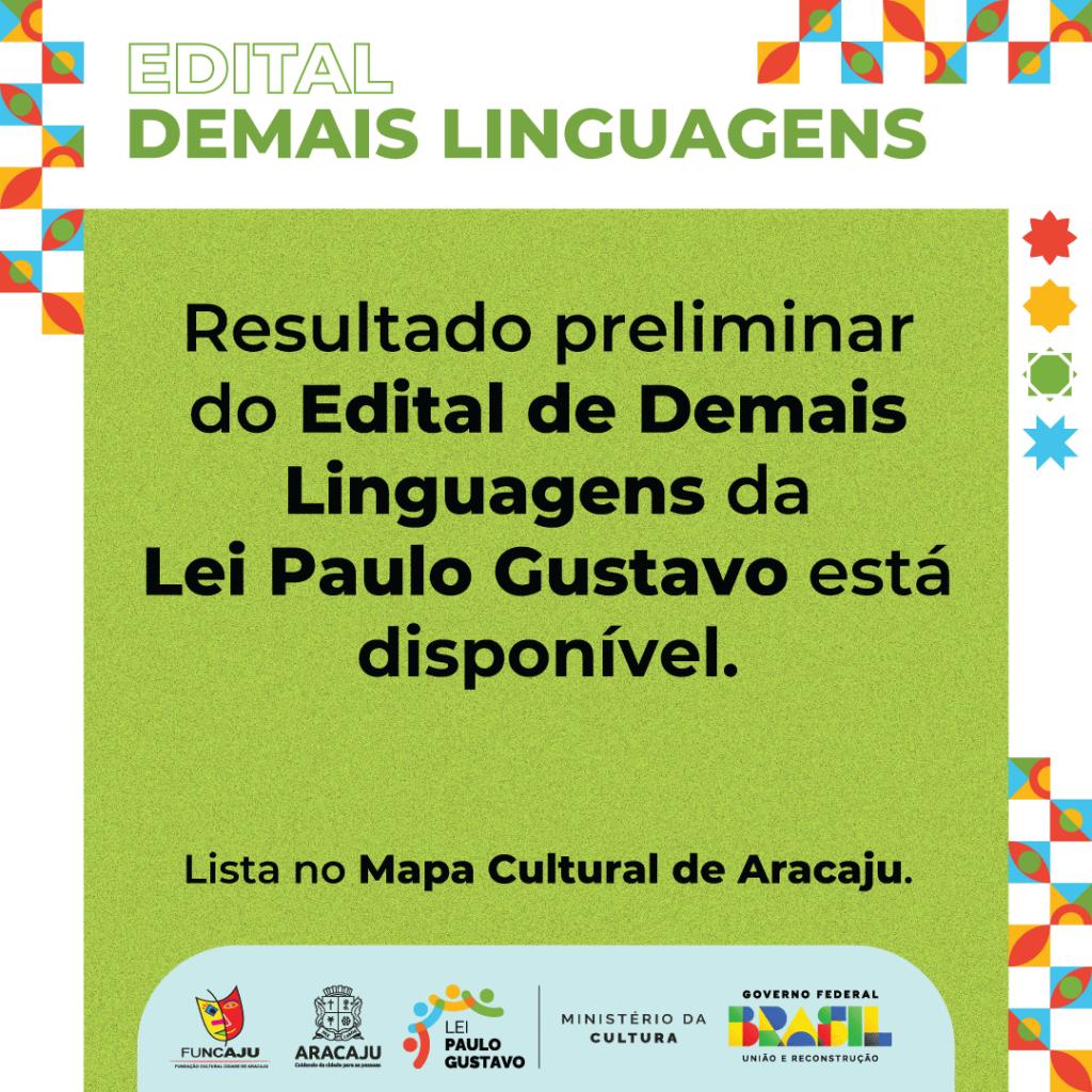 A Prefeitura de Aracaju, por intermédio da Fundação Cultural Cidade de Aracaju (Funcaju), torna público o resultado preliminar do Edital de Demais Linguagens da Lei Paulo Gustavo. A capital sergipana contou com cinco editais referentes a Lei Emergencial, por meio dos recursos do Fundo Nacional da Cultura (FNC), provenientes do Ministério da Cultura (MinC).