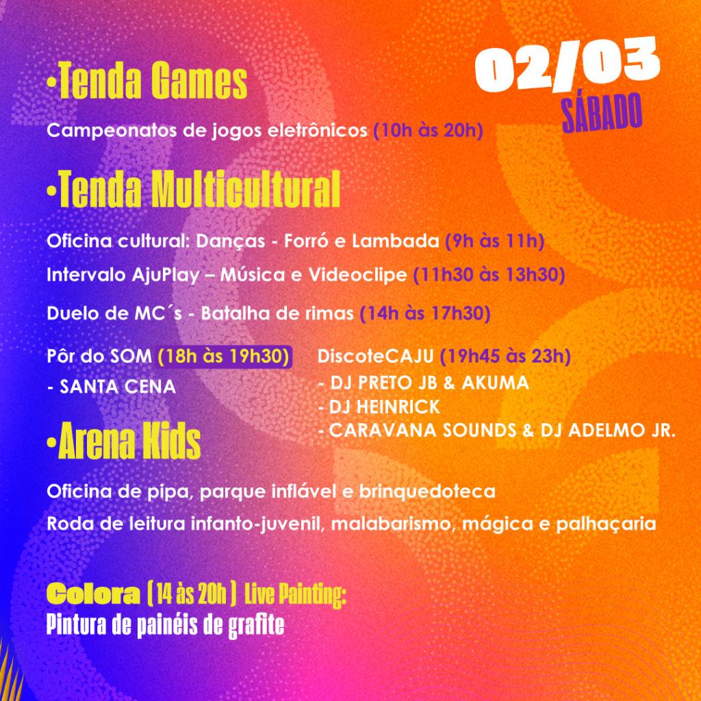 Na sexta-feira, 1° de março, a Tenda Multicultural apresentará danças folclóricas, batalha de slam, especial kids, com a presença dos ilustres Duda Galvão, Pôr do Som, com Timbal de Rua e Afoxé Di Preto, DiscoteCAJU, com Juu Faryas, Gessana Shakti e Anny B. Já a Tenda Games realiza o campeonato de jogos eletrônicos, como LOL, FreeFire, CS Go, Valorant, EFOOTBALL, Streete Figth 2, FIFA, Pocket Bravery, EAFC 24 e Grand Blue. Na Arena Kids acontece oficina de pipa, roda de leitura infanto-juvenil, brinquedoteca, parque inflável (cama elástica, futebol de sabão, touro mecânico, entre outros), malabarismo, mágica e palhaçaria.