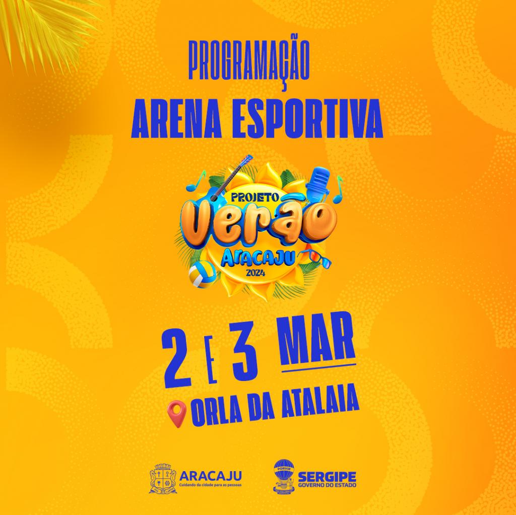 O Projeto Verão 2024, realizado pela Prefeitura de Aracaju, em parceria com o Governo de Sergipe, acontece nos próximos dias 1º, 2 e 3 de março. Com uma ampla programação multicultural, o evento também conta com diversas atividades esportivas que serão realizadas no sábado e domingo, 2 e 3, respectivamente, durante os turnos da manhã e da tarde, na Arena Esportiva montada na Orla da Atalaia.
