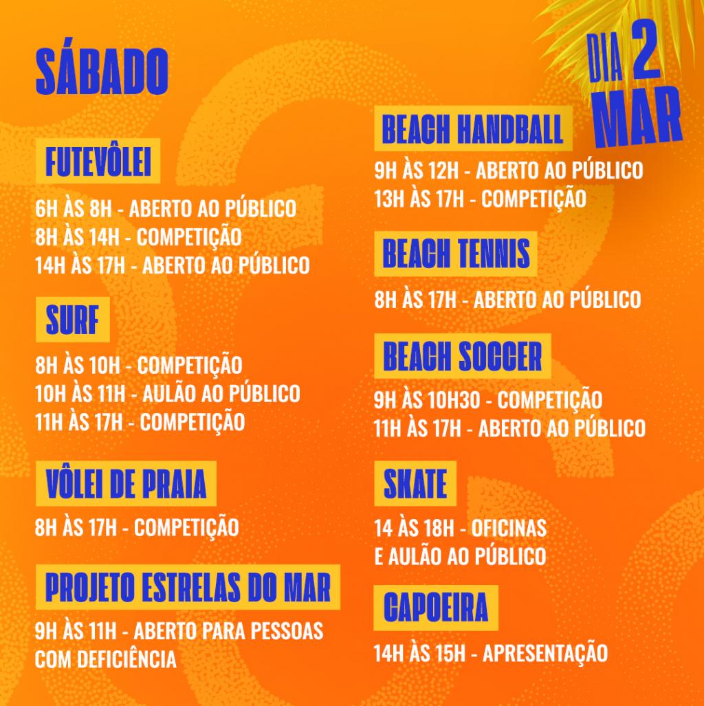 Durante os dois dias serão desenvolvidas competições e aulões de nove modalidades de esportes: beach handball, beach soccer, beach tennis, beach wrestling, capoeira, futevôlei, patinação, skate, surf e vôlei de praia. Além disso, o Projeto Estrelas Mar realizará o banho de mar assistido para pessoas com deficiência.
