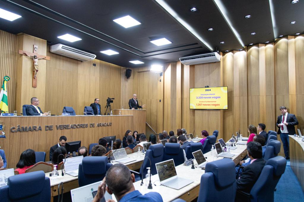 Na manhã desta quarta-feira, 6, o secretário municipal da Educação, Ricardo Abreu, esteve na Câmara Municipal de Aracaju (CMA) para discorrer sobre os dados da matrícula online 2024. Na ocasião, o gestor explanou acerca de todas as ações que estão sendo tomadas para ampliar o número de vagas nas unidades de ensino da rede municipal. A presença do gestor na CMA foi fruto de um convite da Comissão de Educação.