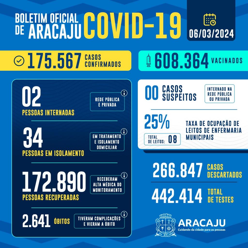 Com isso, 175.567 pessoas foram diagnosticadas com covid-19 em Aracaju. Destas, duas estão internadas em hospital e 34 estão em isolamento domiciliar; 172.890 que estavam infectados já estão recuperados e 2.641 vieram a óbito.