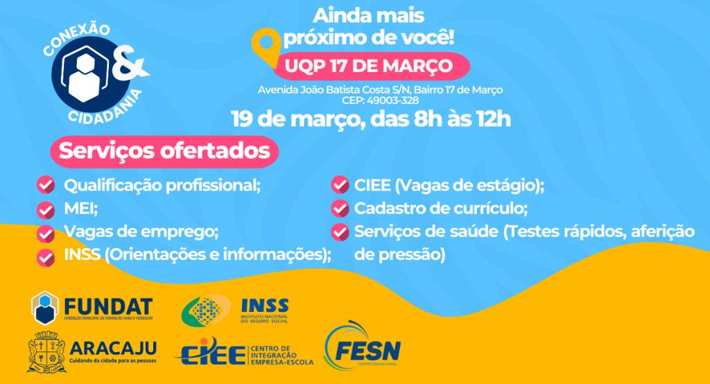 Após duas edições de sucesso realizadas este mês nos bairros Santa Maria e Santos Dumont, o projeto Fundat: Conexão e Cidadania chega ao bairro 17 de Março na próxima terça-feira, 19, a partir das 8h. O evento é uma iniciativa da Prefeitura de Aracaju, por meio da Fundação Municipal de Formação para o Trabalho (Fundat), a fim de aproximar a comunidade dos serviços e trabalhos executados pela gestão municipal, através de um mutirão de atendimentos nas Unidades de Qualificação Profissional (UQP’s) da capital.