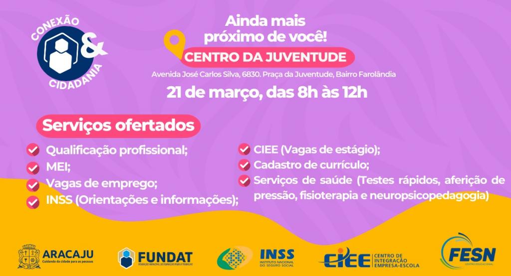O projeto piloto “Fundat: Conexão e Cidadania” chega ao Centro da Juventude, no conjunto Augusto Franco, no bairro Farolândia, nesta quinta-feira, 21, encerrando o ciclo do mês de março com chave de ouro. A ação, realizada pela Prefeitura de Aracaju, por meio da Fundação Municipal de Formação para o Trabalho (Fundat), levará até a Unidade de Qualificação Profissional (UQP) do bairro Farolândia, toda equipe e aparato necessário para a realização de serviços como qualificação profissional, formalização de MEI, encaminhamento para o mercado de trabalho e cadastro de currículo.
