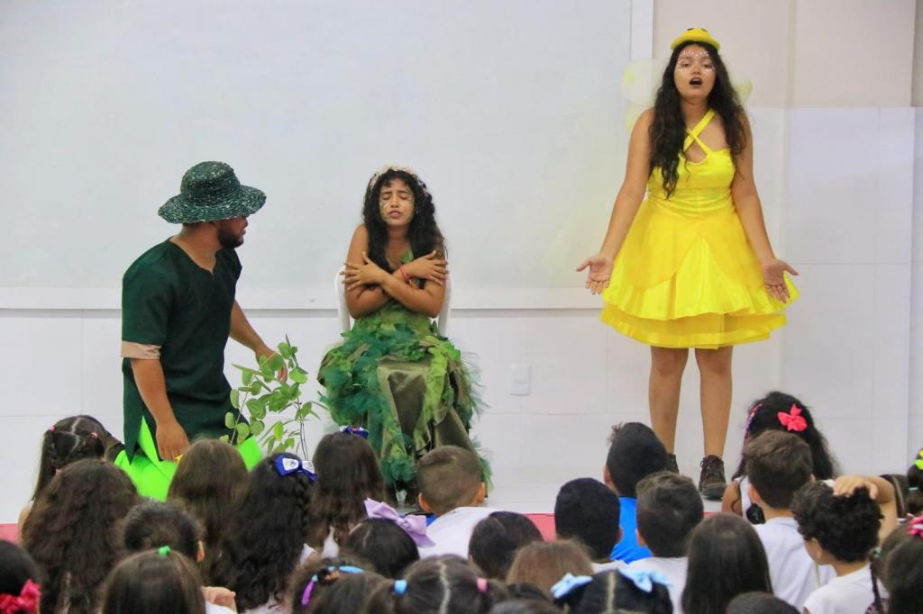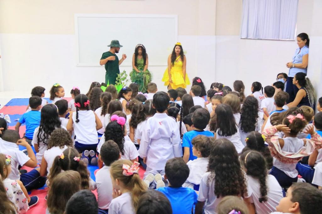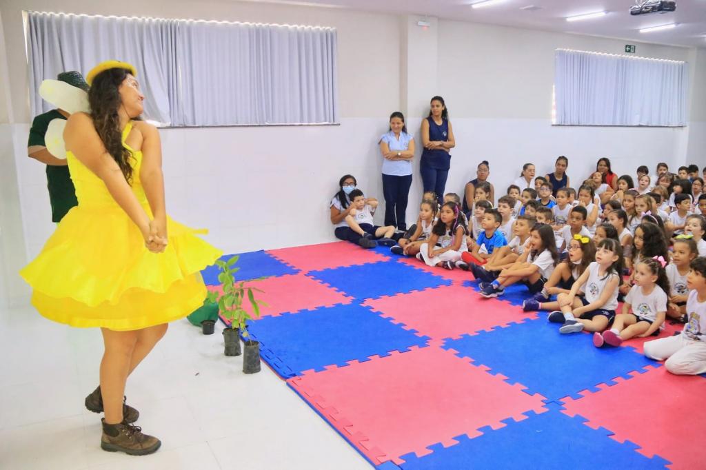Com olhares curiosos, alunos do 1º ao 4º ano do Colégio Santa Chiara - unidade escolar da rede particular de ensino, localizada no bairro Santa Luzia -, acompanharam atentos a esquete teatral preparada pela equipe da Educação Ambiental da Secretaria Municipal do Meio Ambiente (Sema). A apresentação, que ocorreu nesta quinta-feira, 21, levou aos estudantes um lembrete importante sobre os cuidados com a água e o respeito à natureza, e em alusão ao Dia Mundial da Água, celebrado nesta sexta-feira, 22.