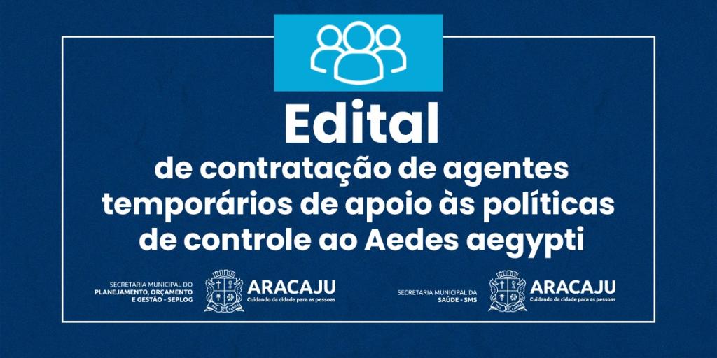A Prefeitura de Aracaju divulgou, nesta quarta-feira, 27, o edital de abertura do Processo Seletivo Simplificado (PSS) para contratação, por tempo determinado, de agentes temporários de apoio às políticas de controle ao Aedes aegypti. O PSS é realizado pela Secretaria Municipal do Planejamento, Orçamento e Gestão (Seplog) e pela Secretaria Municipal da Saúde (SMS). O edital está disponível na seção de Editais. Clique aqui para acessar.