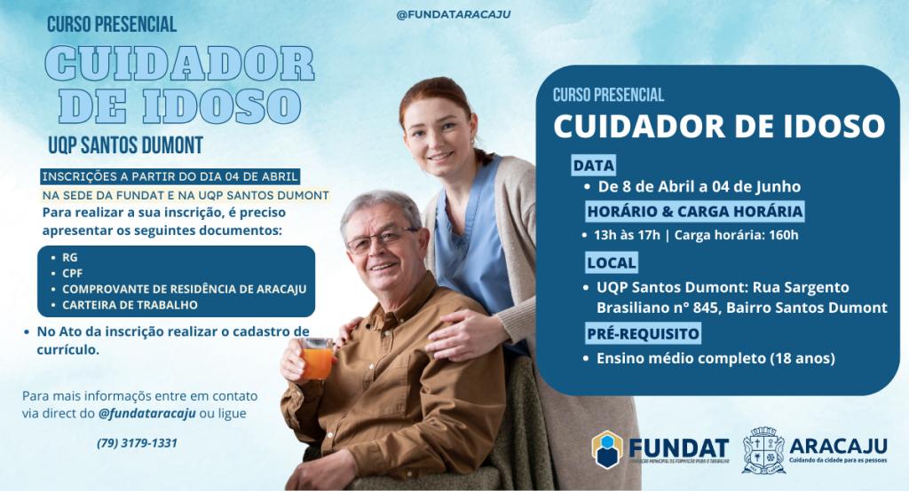 Dando início ao calendário de cursos de 2024, a Prefeitura de Aracaju, por meio da Fundação Municipal de Formação para o Trabalho (Fundat), inicia nesta quinta-feira, 4, as inscrições para a primeira turma do ano do curso de Cuidador de Idosos. Estão sendo disponibilizadas 50 vagas. Os interessados têm até sexta-feira, 5, para comparecer pessoalmente à sede da Fundat, no horário das 7h às 17h, e efetuar a inscrição, enquanto durarem as vagas.