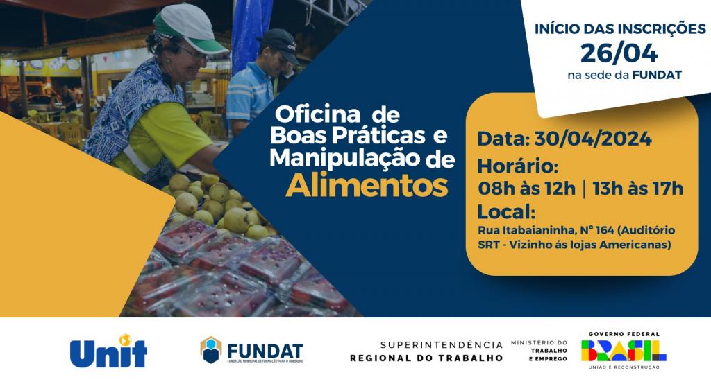 Nesta sexta-feira, 26, a Prefeitura de Aracaju, através da Fundação Municipal de Formação para o Trabalho (Fundat) abre as inscrições para 80 novas vagas na Oficina de Boas Práticas na Manipulação de Alimentos. Desta vez a qualificação foi pensada para atender os comerciantes de alimentos e bebidas que atuarão em todo o Estado durante os festejos juninos.