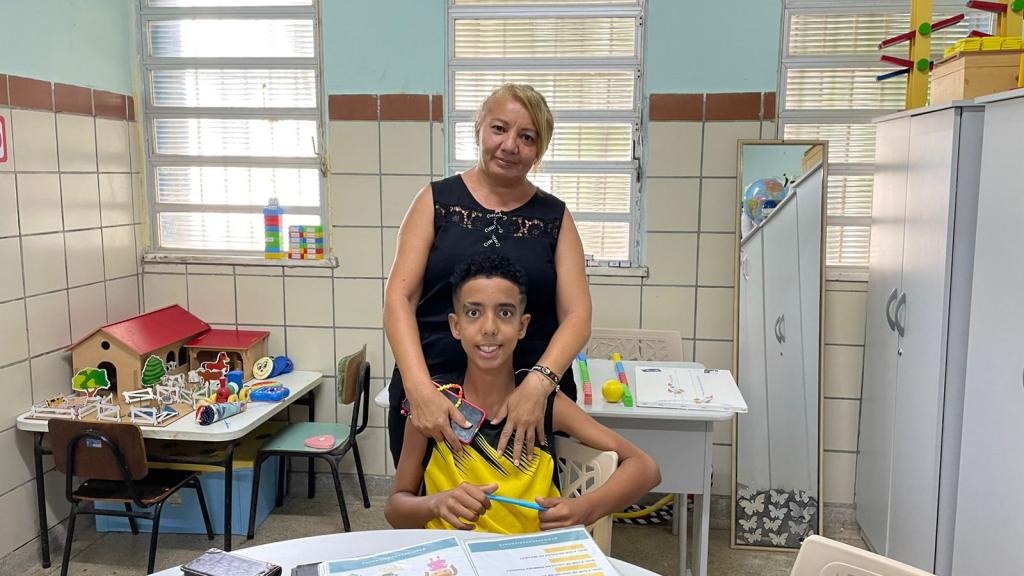 Mãe do estudante Lauro, que é autista e faz atendimento na sala de recursos da Emef Juscelino Kubitscheck, Roberta Figueiredo declara que o filho está aprendendo a ler e já socializa super bem.