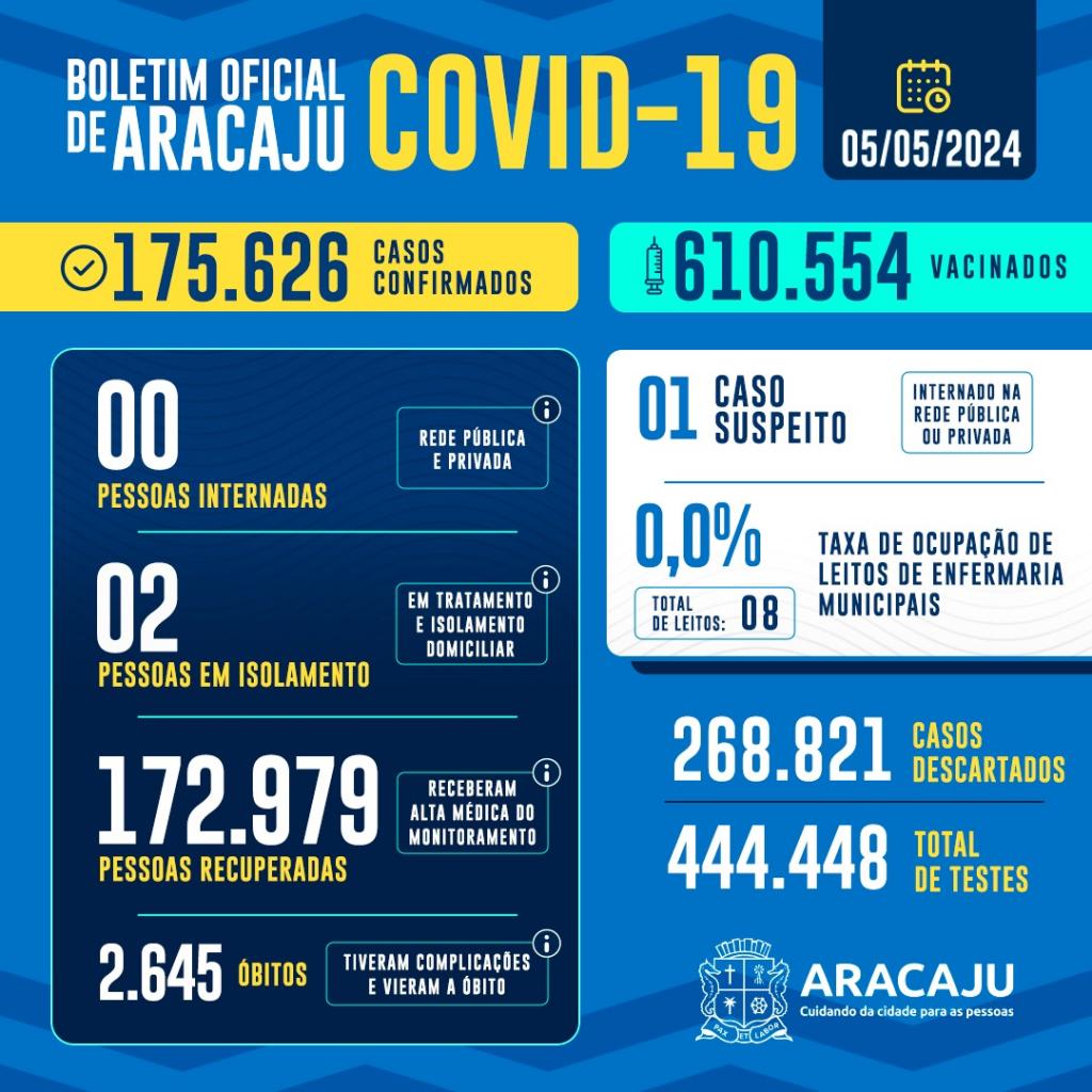 Com isso, 175.626 pessoas foram diagnosticadas com covid-19 em Aracaju. Destas, 172.979 que estavam infectados já estão recuperados e 2.645 foram a óbito.