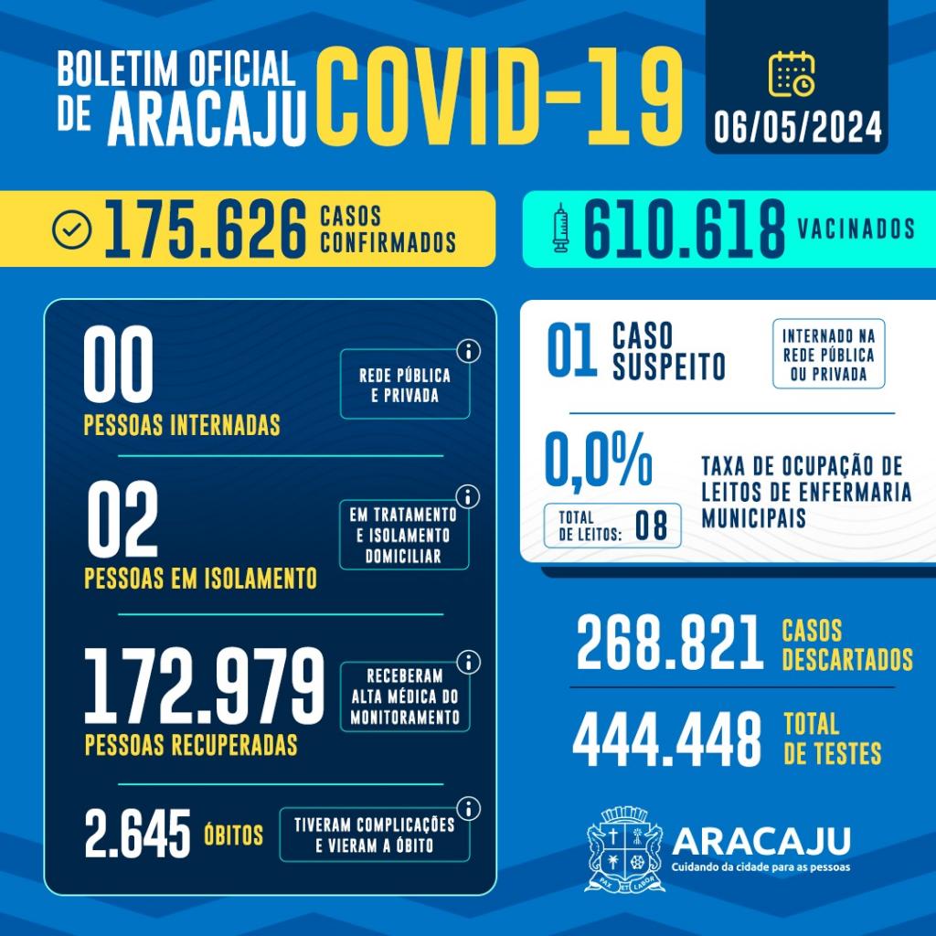 Com isso, 175.626 pessoas foram diagnosticadas com covid-19 em Aracaju. Destas, 172.979 que estavam infectados já estão recuperados e 2.645 vieram a óbito.