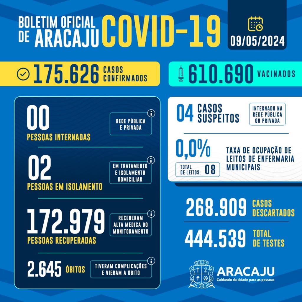 Com isso, 175.626 pessoas foram diagnosticadas com covid-19 em Aracaju. Destas, 172.979 que estavam infectados já estão recuperados e 2.645 vieram a óbito.