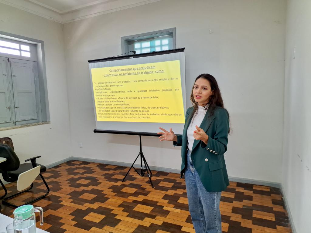 A atividade foi conduzida pelas advogadas Danila Leite e Fabiana Macedo, que explanaram sobre sinais e características de comportamentos nas relações de trabalho que podem se configurar em diferentes tipos de assédio, além de formas de agir perante esse tipo de situação.
