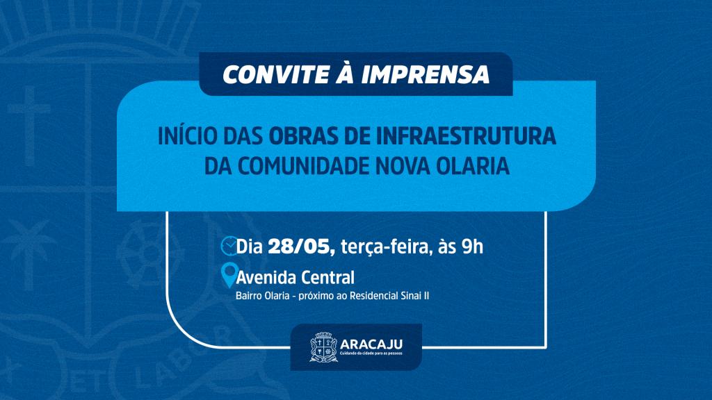 A Prefeitura de Aracaju convida a imprensa para cobrir o ato de assinatura da ordem de serviço para o início das obras de infraestrutura da comunidade Nova Olaria, nesta terça-feira, dia 28, às 9h, no bairro Olaria.