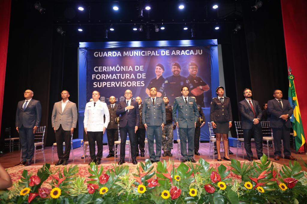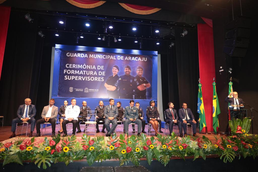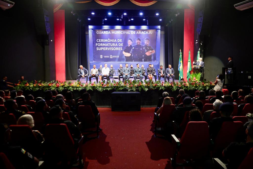 Durante solenidade realizada nesta terça-feira, 28, no Teatro Atheneu, em Aracaju, o prefeito Edvaldo Nogueira participou da cerimônia que promoveu 104 guardiões e guardiãs que fazem parte da Guarda Municipal de Aracaju (GMA), órgão vinculado à Secretaria Municipal da Defesa Social e Cidadania (Semdec). Com a mudança de patente, os agentes passam do cargo de Guarda Municipal Primeira Classe para Supervisor da corporação. A ascensão na corporação foi possível graças ao Plano de Carreira, estabelecido pela gestão municipal em junho do ano passado, e aconteceu através de um curso de habilitação ao quadro de supervisores da GMA, realizado este ano. O gestor municipal enfatizou a importância da valorização desses servidores que cuidam diariamente da segurança pública de Aracaju.