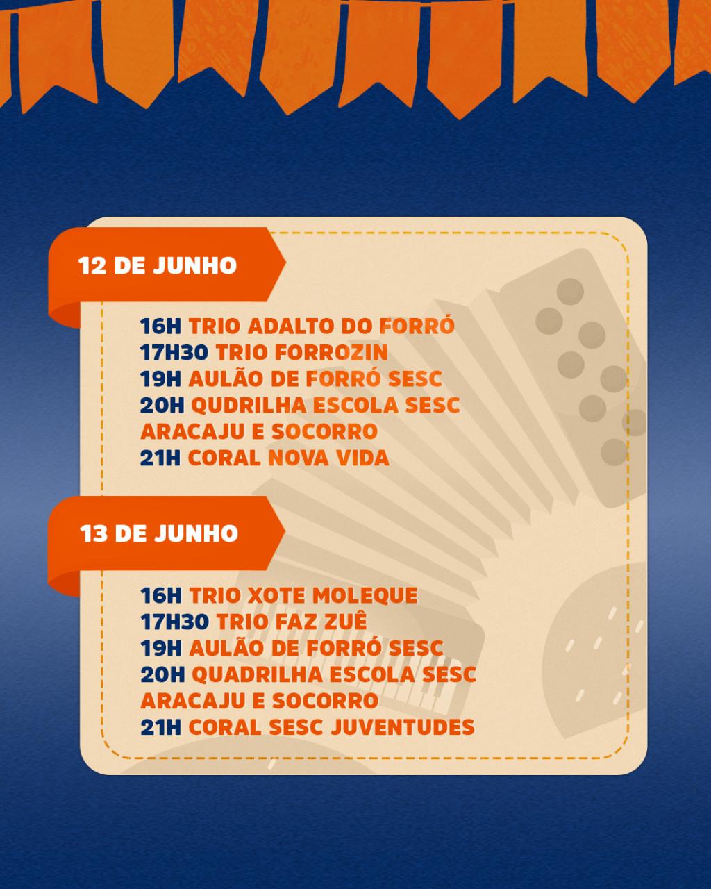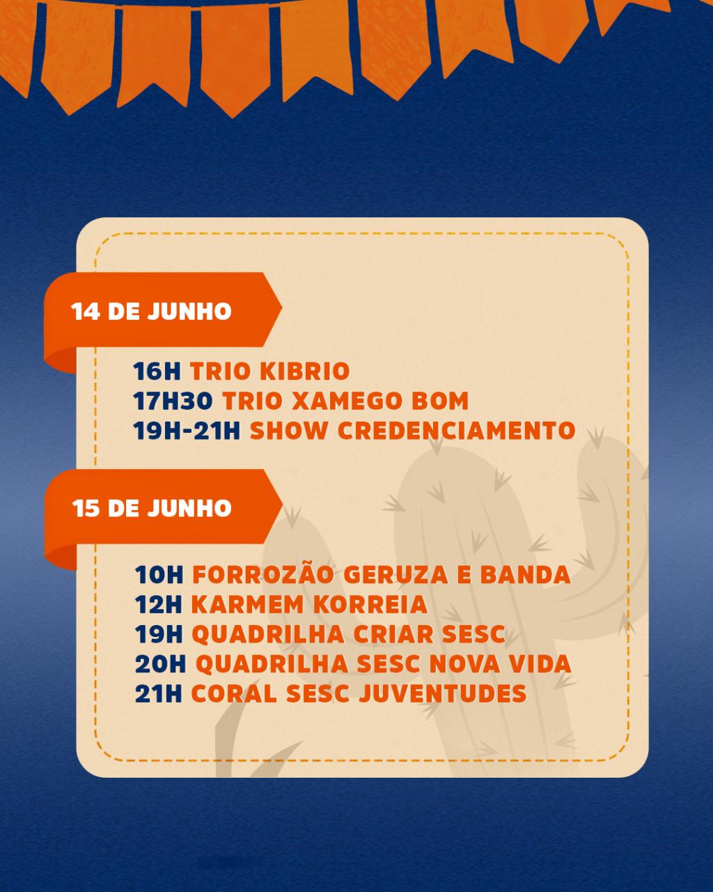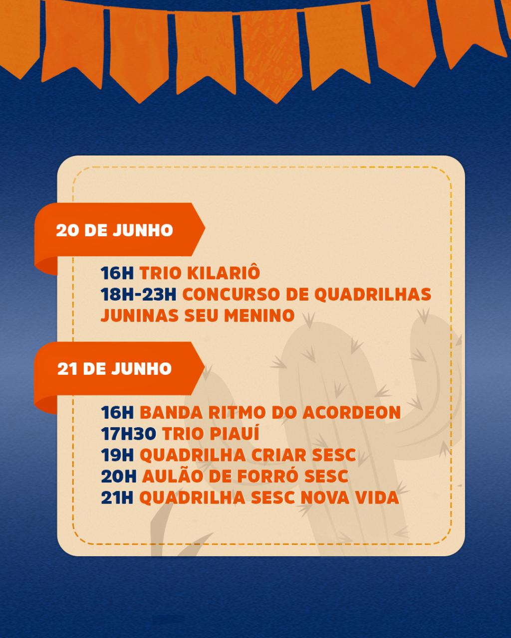 A programação, que seguirá até o dia 21 de junho, das 16h às 21h, conta com várias atrações artísticas e aulões beneficentes. Entre os dias 17 e 20 de junho, o público poderá acompanhar não só apresentações musicais, mas também o "Concurso de Quadrilhas Juninas Seu Menino”, promovido pelo Serviço Social do Comércio (Sesc).