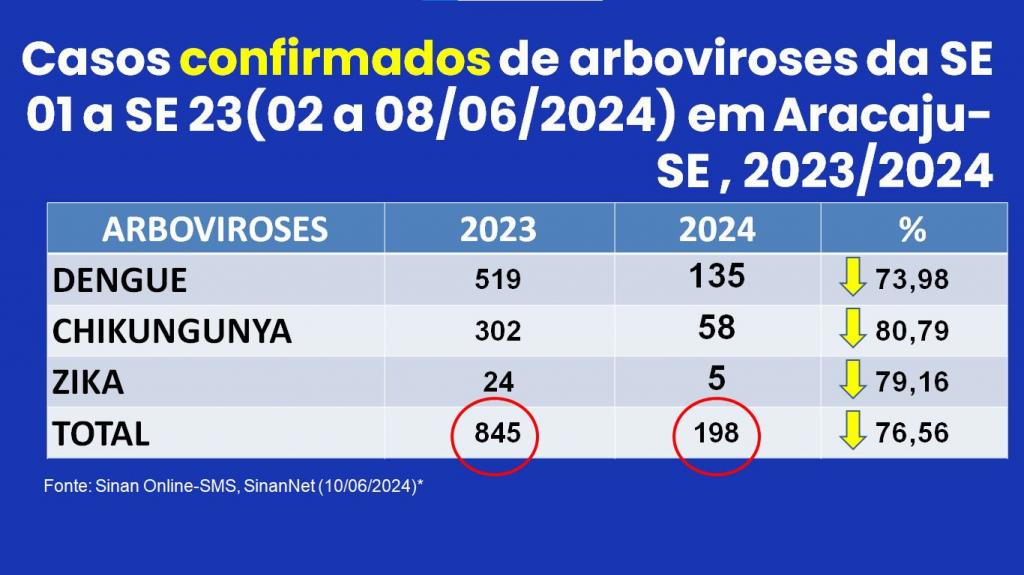 No ano passado, no período de janeiro até a primeira semana de junho, foram confirmados 845 casos de dengue, zika e chikungunya. Este ano, no mesmo período, foram confirmados 198 casos, uma queda de 76,56% nos casos confirmados das três doenças em 2024 em relação ao ano passado.
