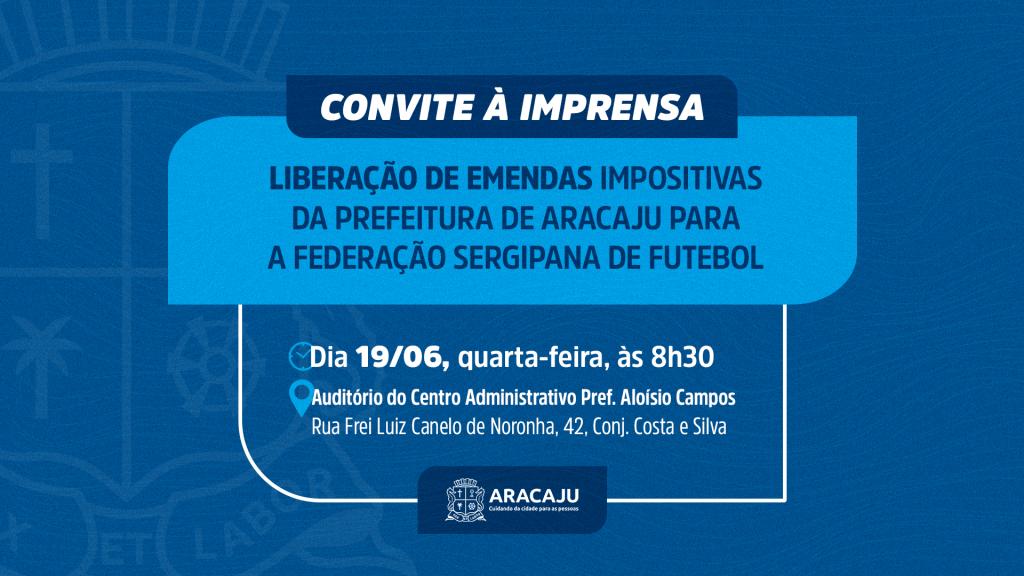 A Prefeitura de Aracaju convida a imprensa para cobrir o ato de assinatura do termo de autorização para a execução de emendas impositivas da administração municipal com a Federação Sergipana de Futebol, que será realizado na próxima quarta-feira, dia 19, às 8h30, no Centro Administrativo Prefeito Aloísio Campos.