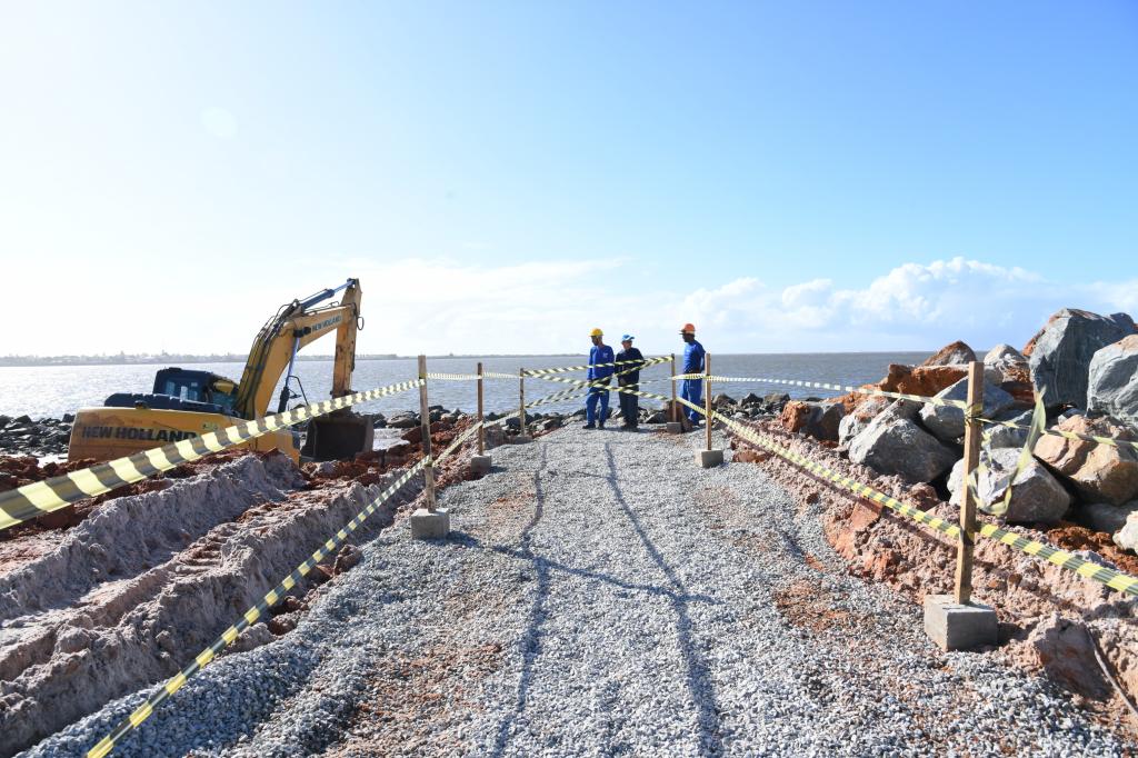 A construção da Via Litorânea contempla a implantação de rede de drenagem pluvial, terraplanagem, pavimentação em piso de concreto intertravado, ciclovias, meios-fios e passeios em concreto, estacionamentos, e a construção e ampliação da contenção de pedras.