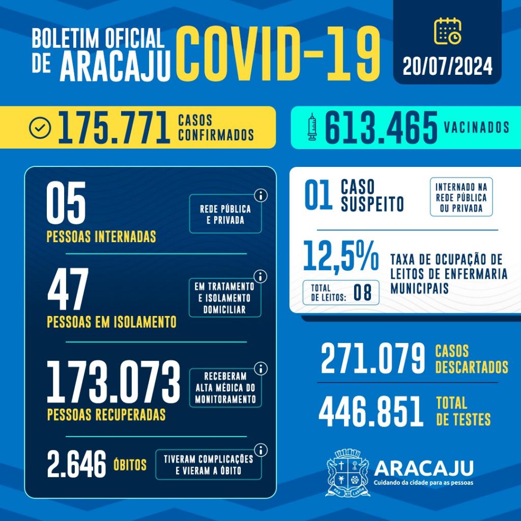 Com isso, 175.771 pessoas foram diagnosticadas com covid-19 em Aracaju. Destas, 173.073 que estavam infectados, já estão recuperados, 43 estão em isolamento domiciliar, cinco internados e 2.646 vieram a óbito.