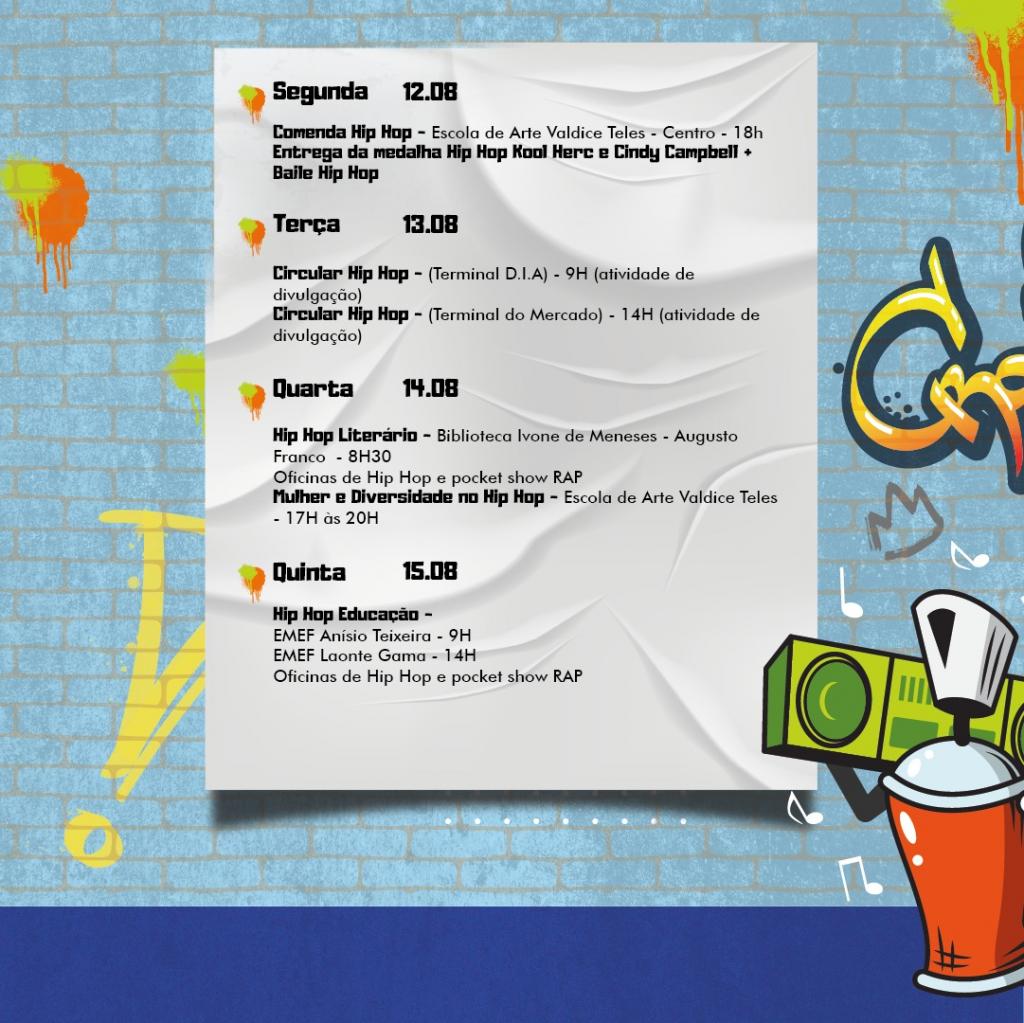 O evento terá início na segunda-feira, dia 12, na Escola de Artes Valdice Teles, onde serão realizadas apresentações e a entrega de honrarias a agentes culturais da arte urbana. Ao longo da semana, a programação desenvolverá ações educativas para alunos da rede pública, rodas de conversa sobre a equidade de gênero e diversidade no setor cultural, além de apresentações de linguagens artísticas como música, grafite, dança e batalhas de rima e poesia.