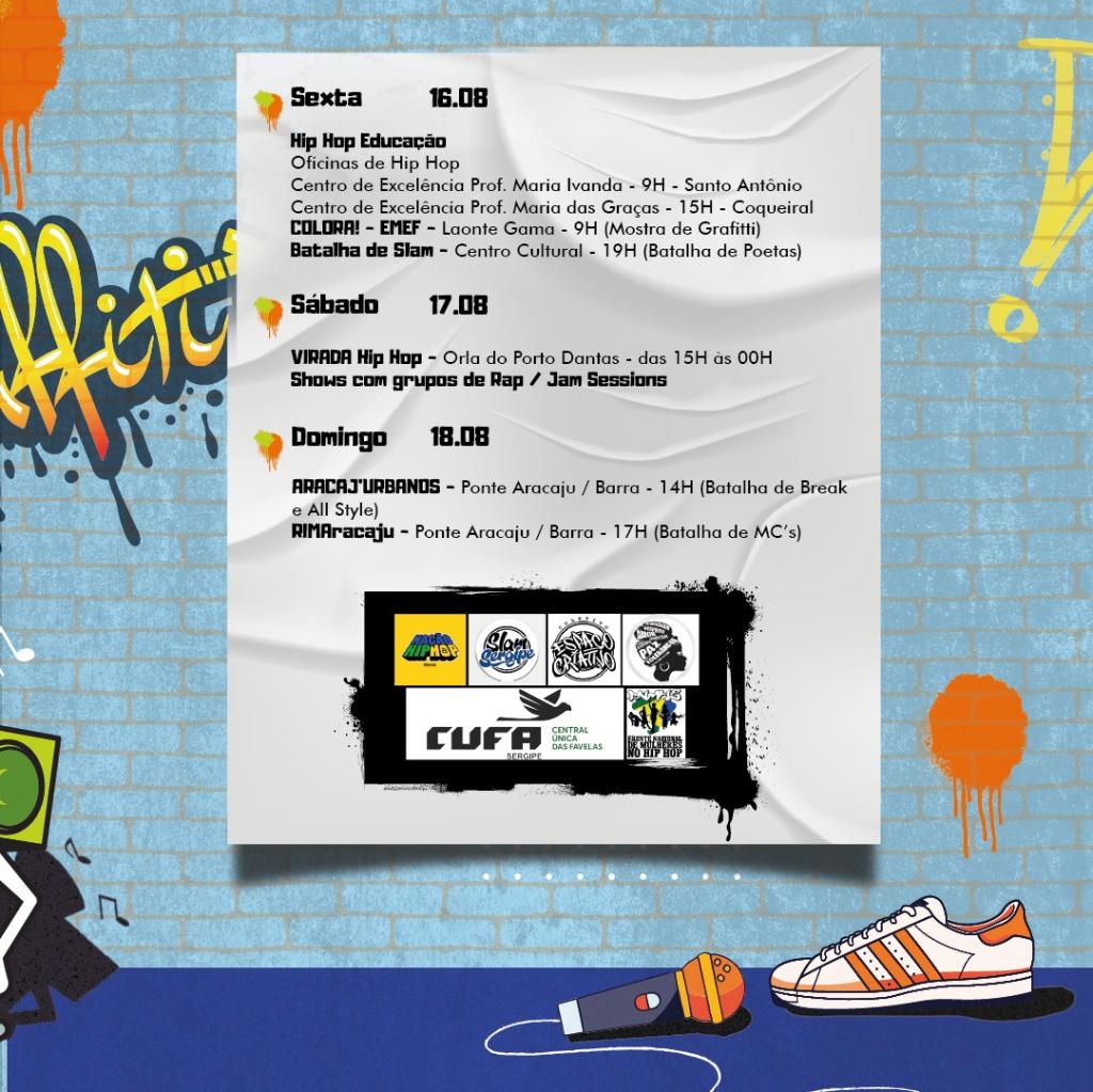 A Fundação Cultural Cidade de Aracaju (Funcaju) realiza entre os dias 12 e 18 de agosto a terceira edição da Semana Municipal do Hip Hop, cuja programação conta com oficinas, apresentações e diversas expressões da cultura urbana. A atividade, que tem o objetivo de oportunizar um momento de apreciação e valorização de expressões artísticas urbanas, acontece em diversos locais da capital sergipana, desde escolas da rede pública de ensino até terminais de ônibus do município.