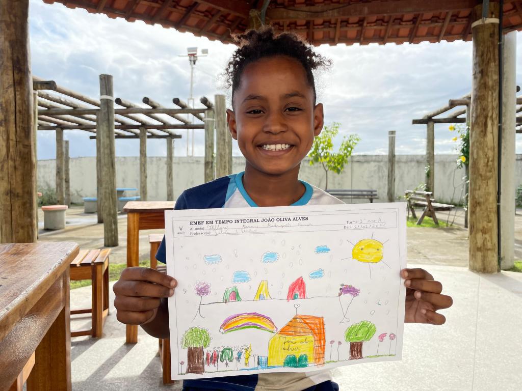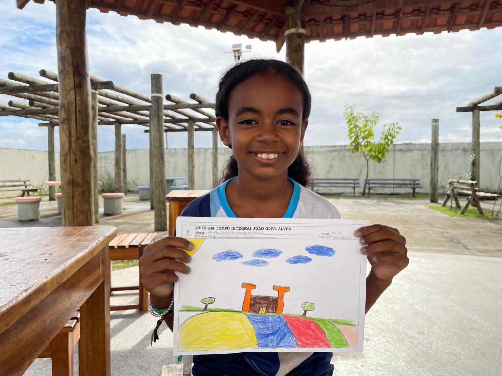 “Eu desenhei o que mais amo e fiquei bem alegre quando soube que ele está bem grande em um ponto de ônibus. Eu gosto muito da minha escola, da minha mãe e dos meus irmãos, por isso que pintei eles todos aqui junto comigo. Estou muito feliz com esse presente”, diz a aluna.