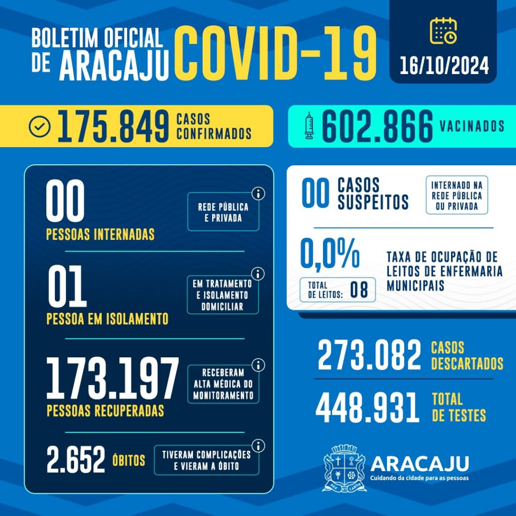 Com isso, 175.849 pessoas foram diagnosticadas com covid-19 em Aracaju. Destas, 173.196 que estavam infectados, já estão recuperados, uma pessoa está em isolamento domiciliar e 2.652 vieram a óbito.