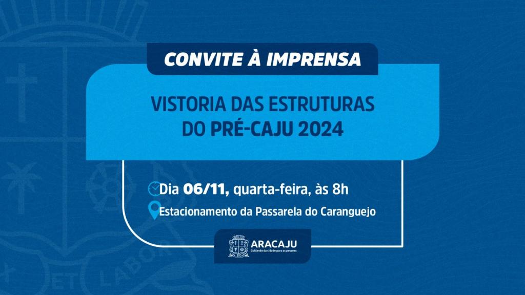 A Prefeitura de Aracaju e o Governo de Sergipe convidam a imprensa para acompanhar a vistoria das estruturas do Pré-Caju 2024, que será realizada nesta quarta-feira, dia 6, às 8h, por órgãos municipais e estaduais, na Orla da Atalaia.