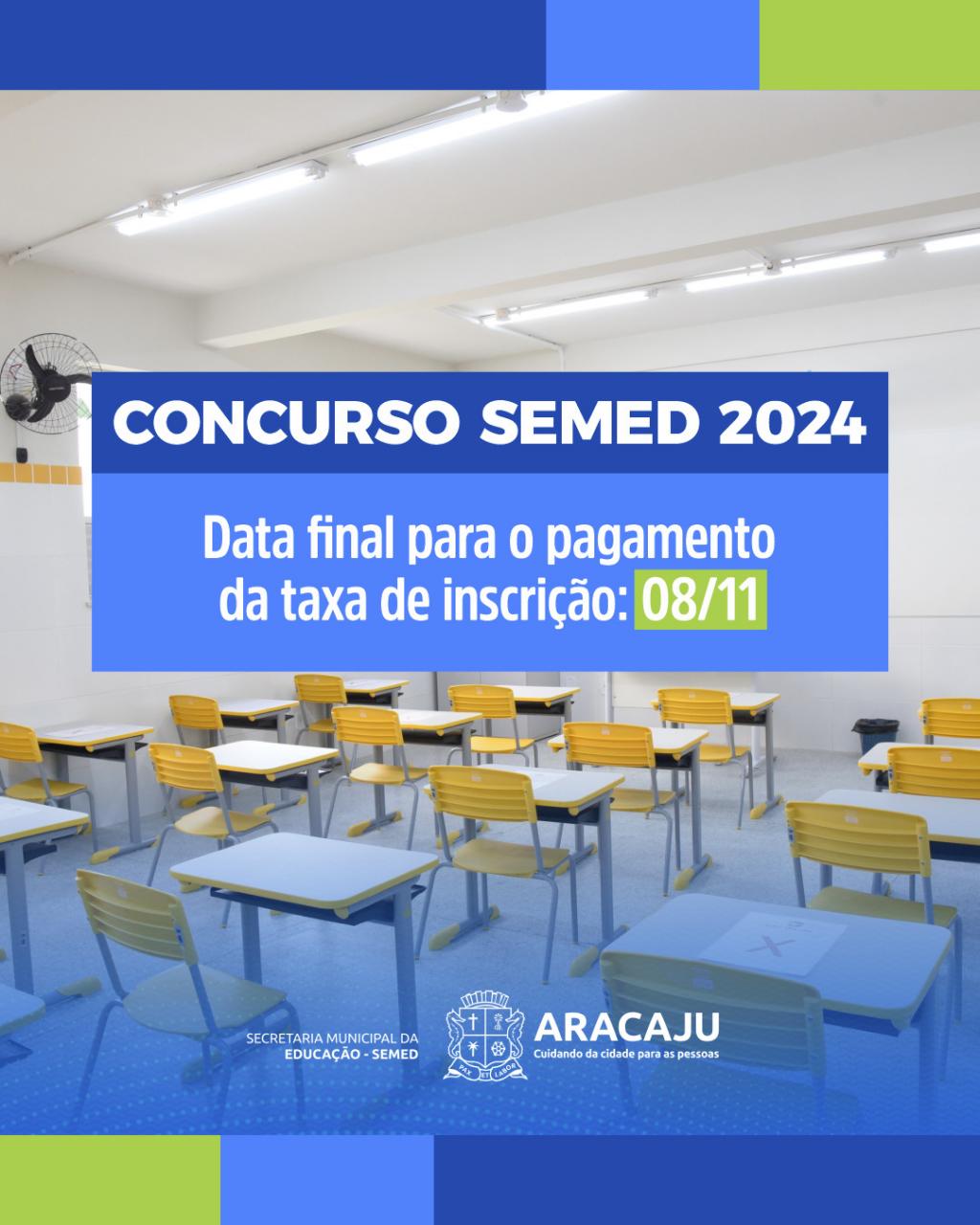 Cumprindo mais uma etapa do edital que rege o concurso público da Secretaria Municipal da Educação (Semed), a Prefeitura de Aracaju divulga o prazo para o pagamento da inscrição no certame, que se encerra na próxima sexta-feira, 8. O boleto, no valor de R$ 74,60, está disponível no site da empresa organizadora do concurso, o Cebraspe.