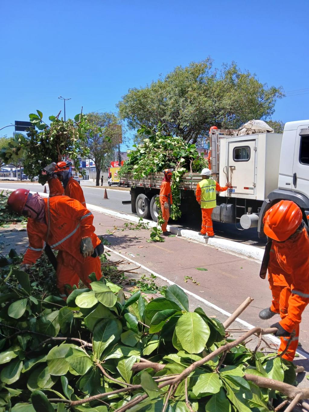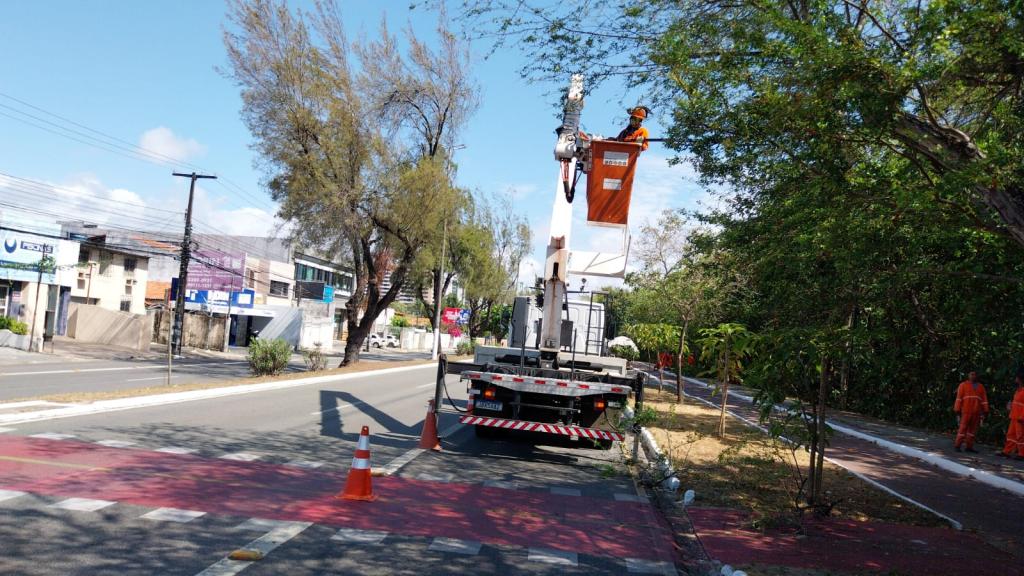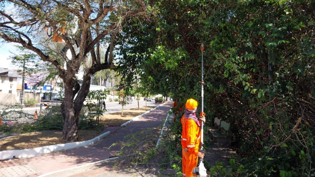 A operação de poda no calçadão Genelício Barreto durará uma semana e está sendo efetivada por cinco equipes: duas atuam no solo, cada uma formada por um cabo de turma e cinco podadores; duas em caminhão pesado, compostas por operadores e motoristas; e uma quinta equipe responsável pelo recolhimento dos galhos após a poda.
