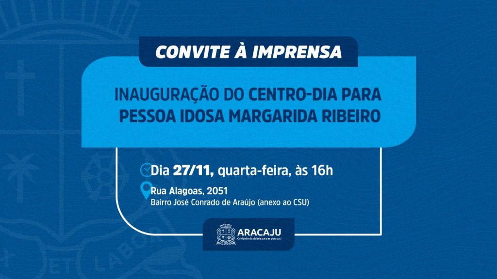 A Prefeitura de Aracaju convida a imprensa para cobrir a solenidade de inauguração do Centro Dia para Pessoa Idosa Margarida Ribeiro, que será realizada nesta quarta-feira, dia 27, às 16h, na rua Alagoas, 2051, bairro José Conrado de Araújo (anexo ao CSU).